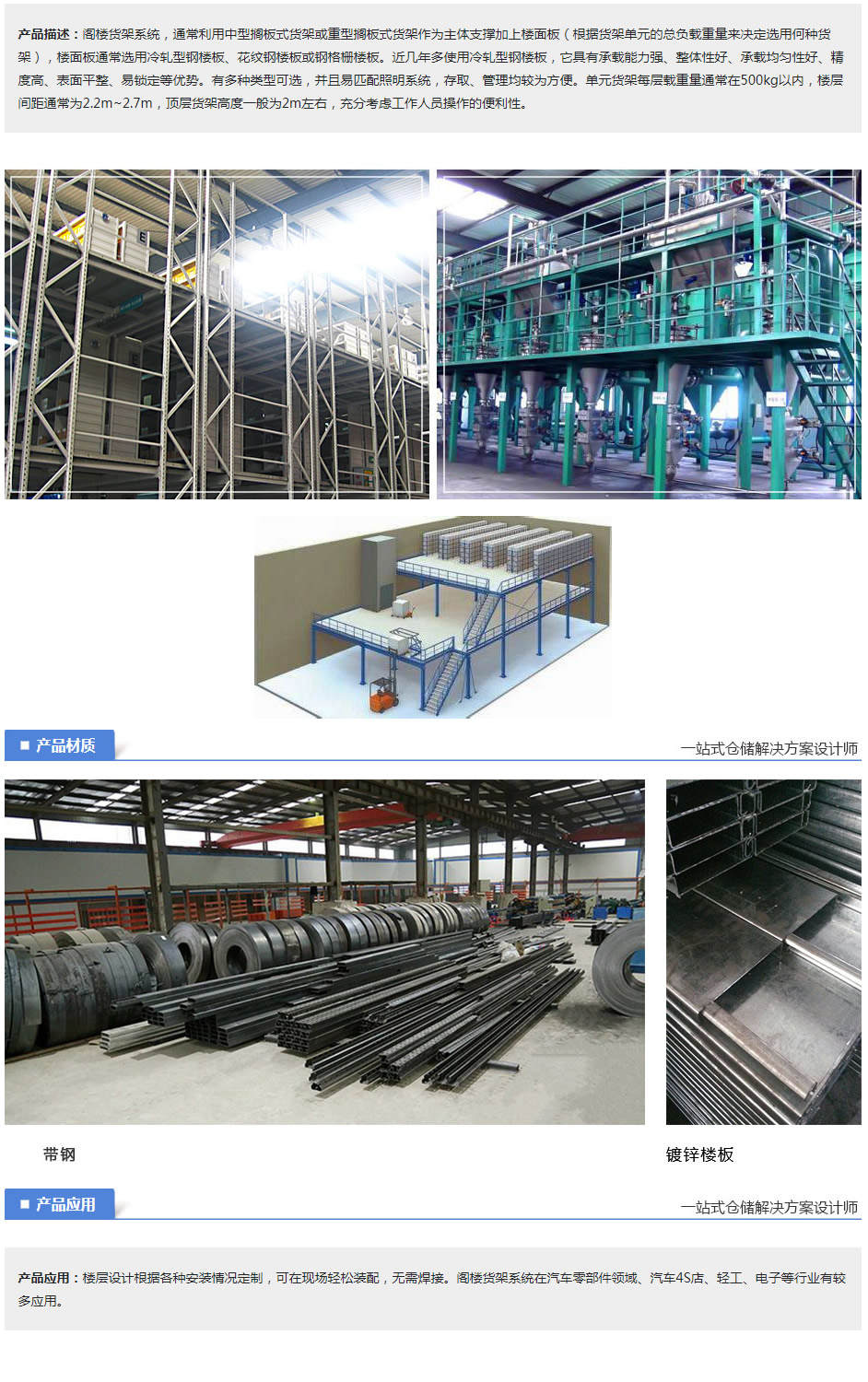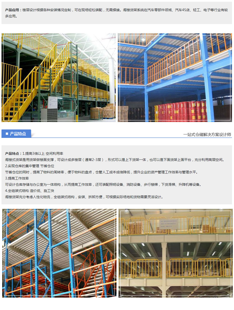产品种类:三层阁楼 货架承载:500KG~2000KG 常规颜色:根据客户需求定制 货架价格: 由于货架结构较为复杂,所以不能马上给您报价,如果您有需要的话可以先与我们联系,我们会安排专业工程师去现场查勘,并设计出合适您的货架。